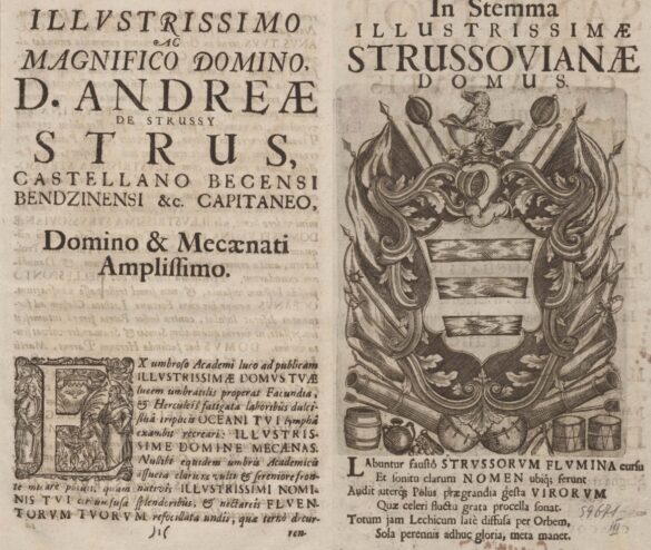 Dedykacja: Jaśnie Oświeconemu i Wielmożnemu Panu, Panu Andrzejowi ze Strusów Strusowi, kasztelanowi bieckiemu, będzińskiemu itd. staroście.
